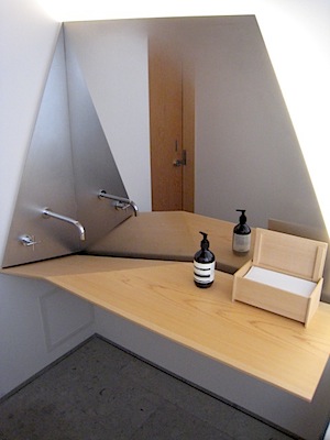 トイレの洗面カウンターは手洗い場が一体となった斬新なデザイン。水撥ねしないよう、吐水の量は少なめ。ハンドソープはAesop社製。