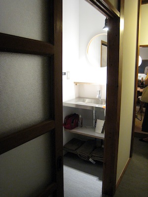昭和テイストのガラスが嵌った引き戸の奥が水まわり。